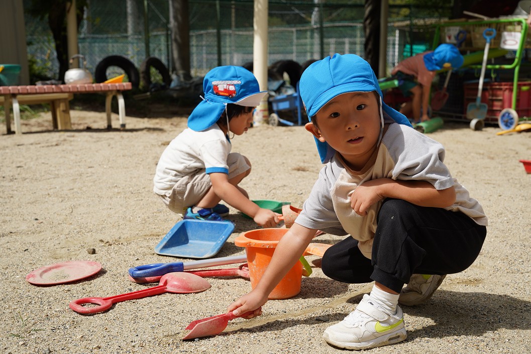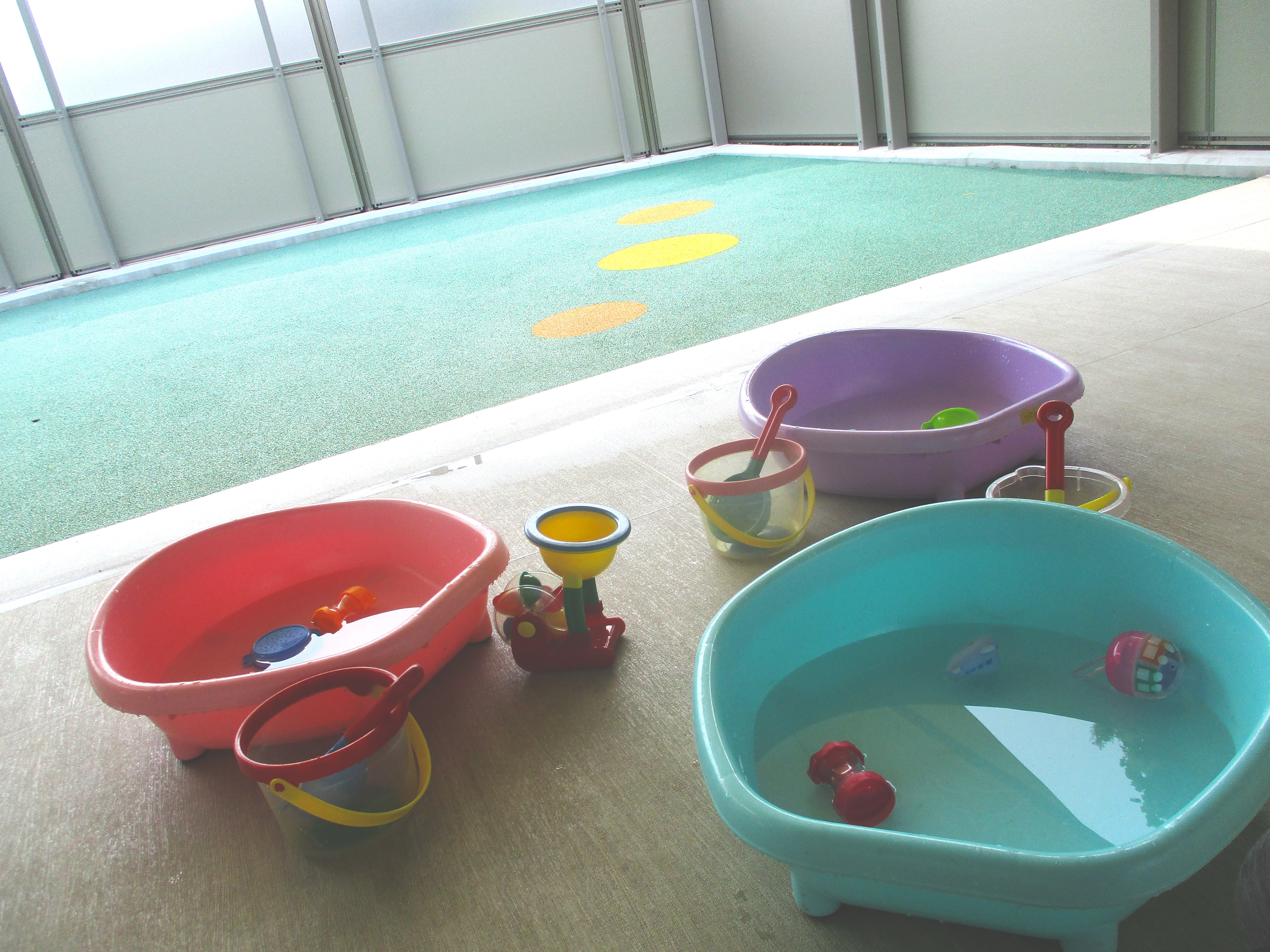 乳児はテラスや乳児園庭で水遊びやプールを行います。