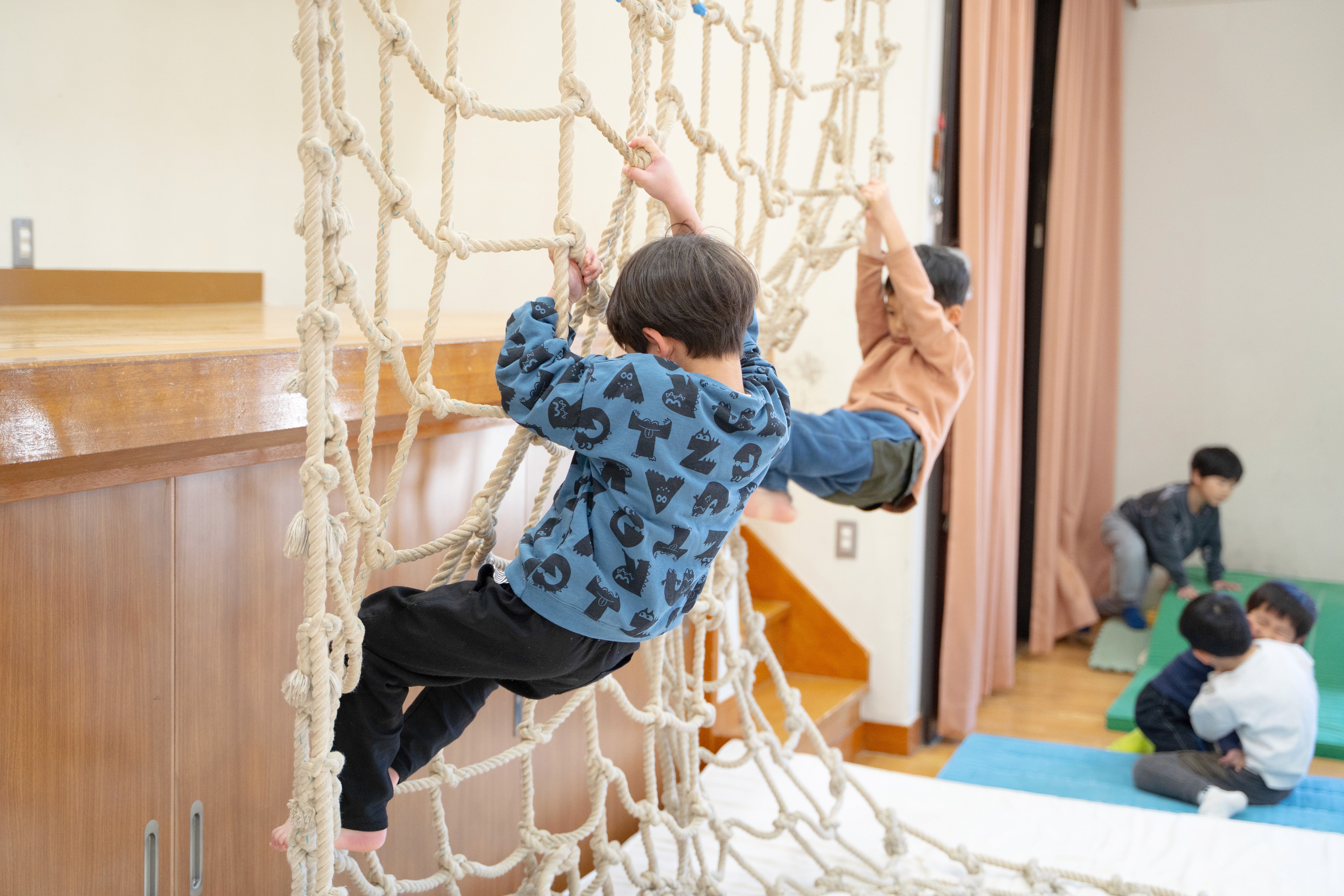 前後に舞台があり、後舞台からはジャンプをしたり網や一本縄がかけられるようになっており、体を十分に動かして遊ぶことができます。