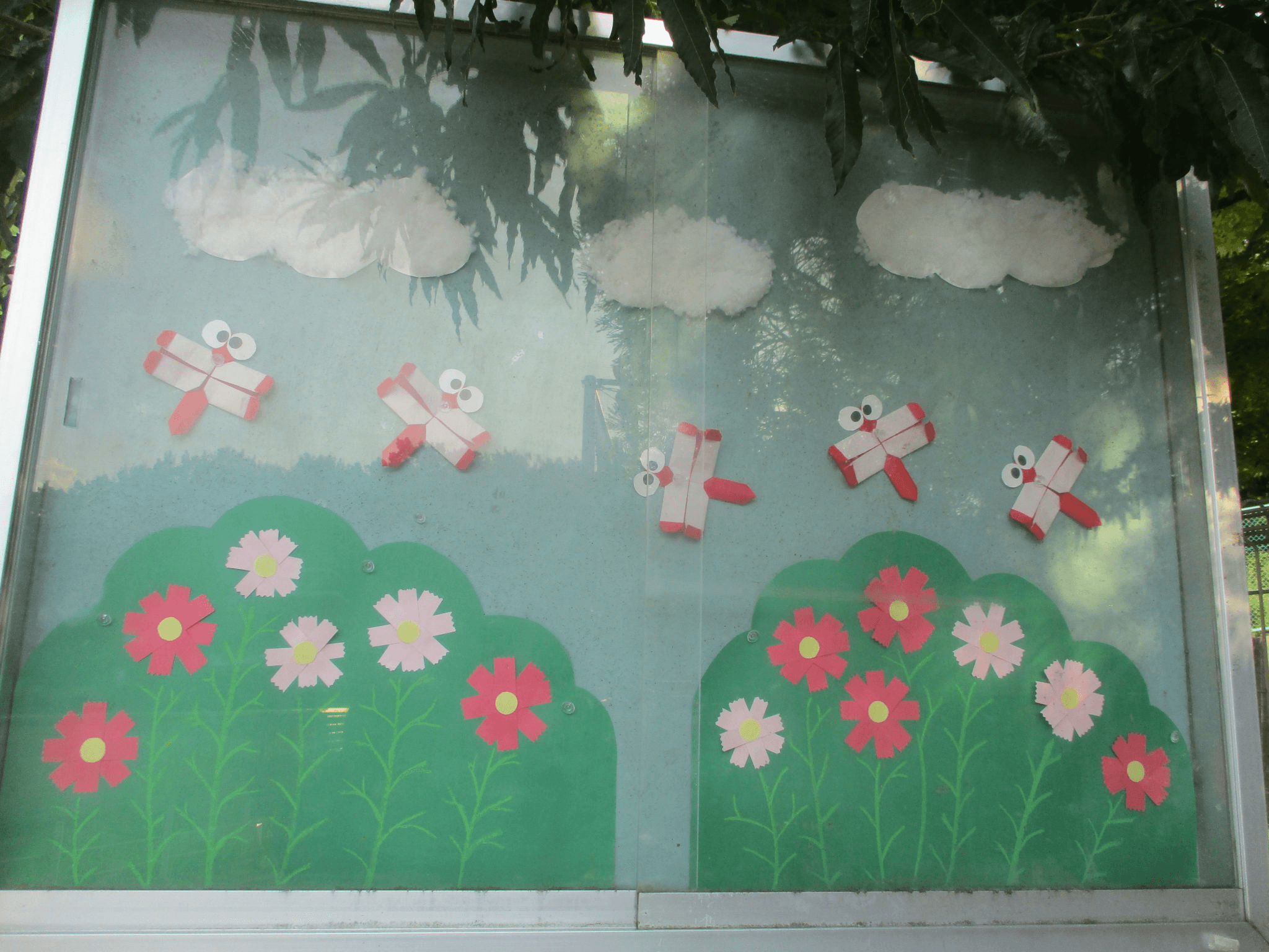 9月のこども園掲示板はコスモスと赤とんぼです。